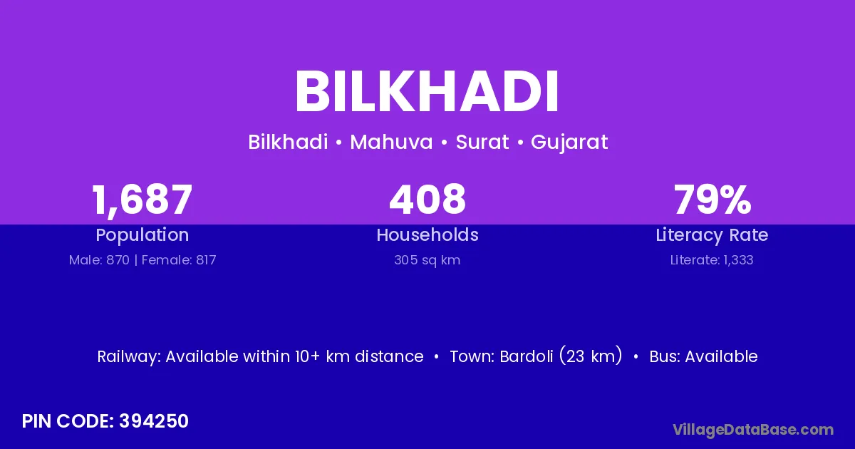 Bardoli (23 km) is the nearest town to Bilkhadi village for major economic activities and is located approximately 23 km away.