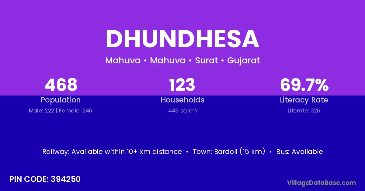 Bardoli (15 km) is the nearest town to Dhundhesa village for major economic activities and is located approximately 15 km away.