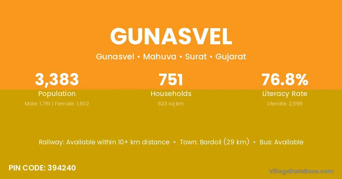 Bardoli (29 km) is the nearest town to Gunasvel village for major economic activities and is located approximately 29 km away.