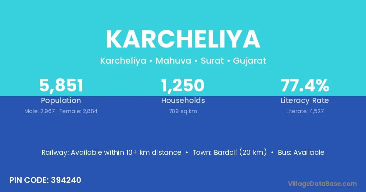Bardoli (20 km) is the nearest town to Karcheliya village for major economic activities and is located approximately 20 km away.
