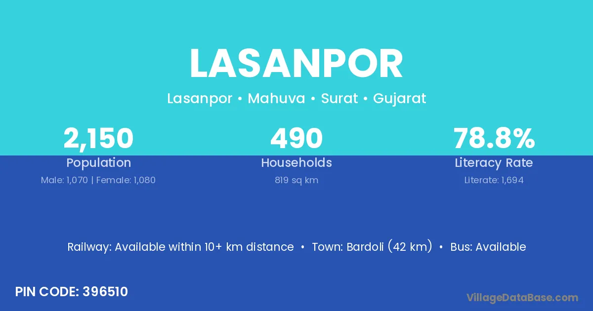 Bardoli (42 km) is the nearest town to Lasanpor village for major economic activities and is located approximately 42 km away.