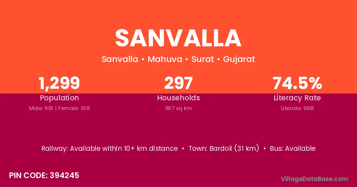 Bardoli (31 km) is the nearest town to Sanvalla village for major economic activities and is located approximately 31 km away.