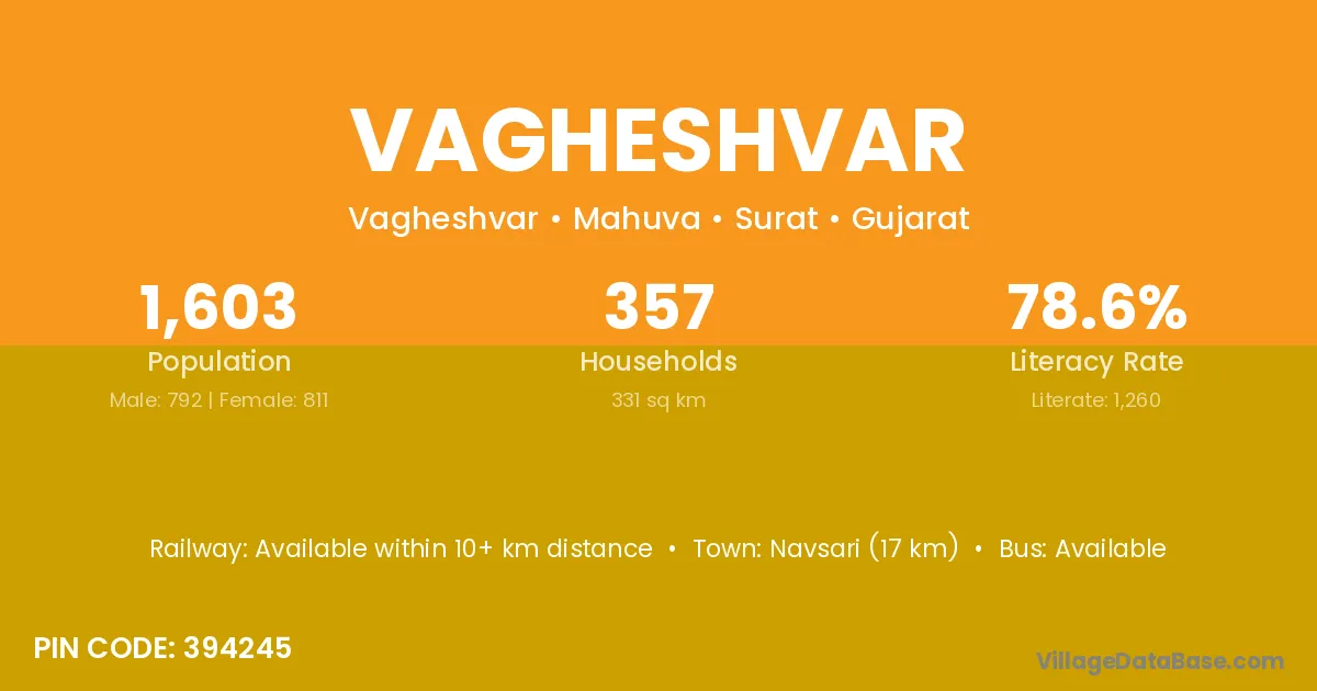 Navsari (17 km) is the nearest town to Vagheshvar village for major economic activities and is located approximately 17 km away.