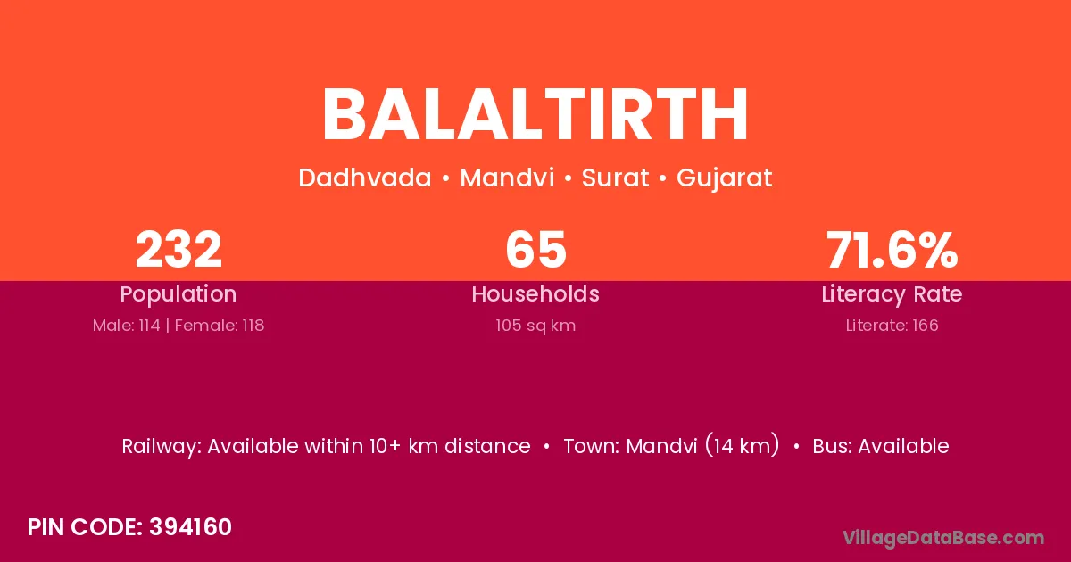 Mandvi (14 km) is the nearest town to Balaltirth village for major economic activities and is located approximately 14 km away.