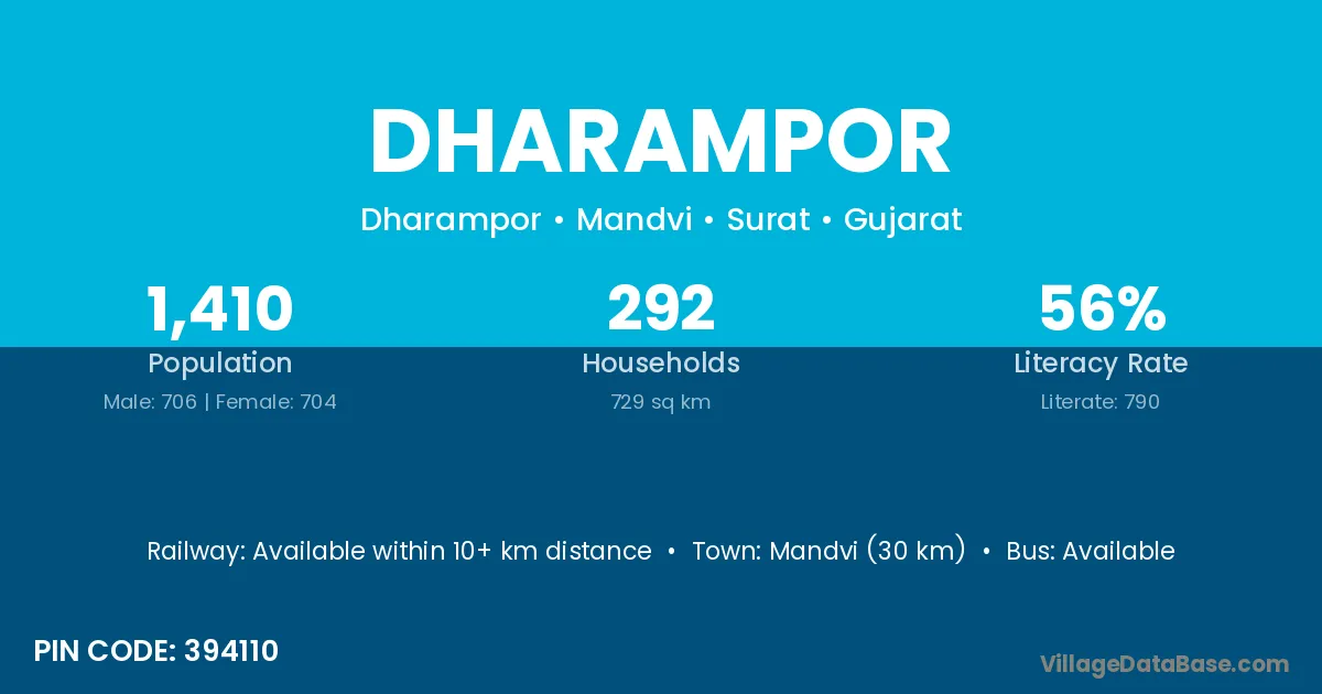 Mandvi (30 km) is the nearest town to Dharampor village for major economic activities and is located approximately 30 km away.