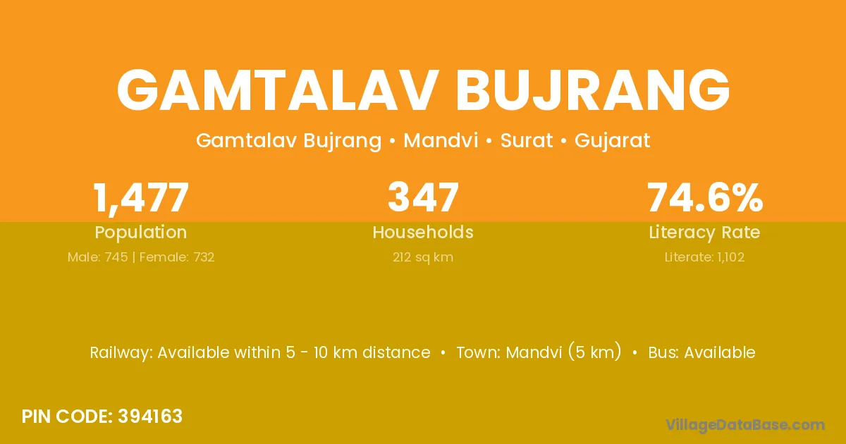 Gamtalav Bujrang village has a total population of 1,477 people, of which 745 are males and 732 are females.