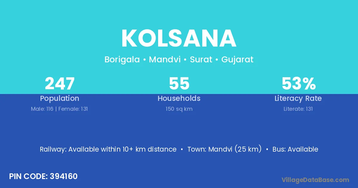 Mandvi (25 km) is the nearest town to Kolsana village for major economic activities and is located approximately 25 km away.