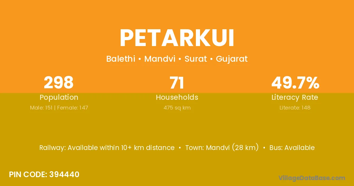 Mandvi (28 km) is the nearest town to Petarkui village for major economic activities and is located approximately 28 km away.