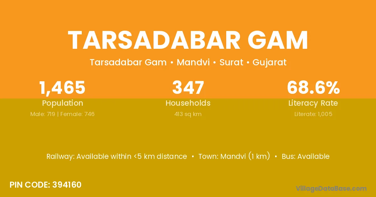 Mandvi (1 km) is the nearest town to Tarsadabar Gam village for major economic activities and is located approximately 1 km away.