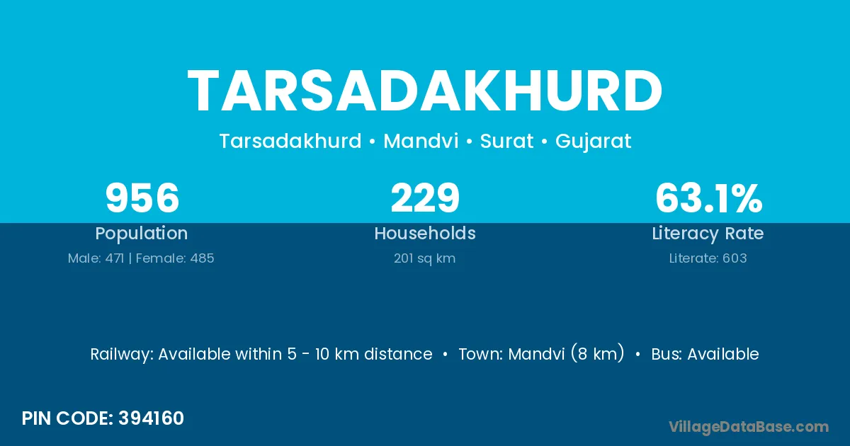 Mandvi (8 km) is the nearest town to Tarsadakhurd village for major economic activities and is located approximately 8 km away.