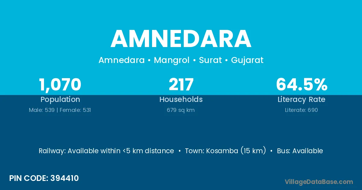 Kosamba (15 km) is the nearest town to Amnedara village for major economic activities and is located approximately 15 km away.