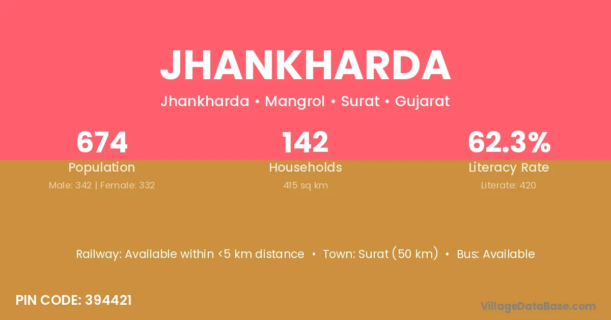 Surat (50 km) is the nearest town to Jhankharda village for major economic activities and is located approximately 50 km away.
