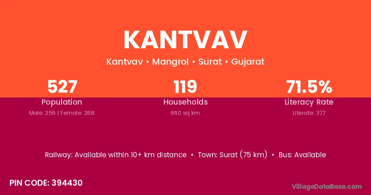 Surat (75 km) is the nearest town to Kantvav village for major economic activities and is located approximately 75 km away.