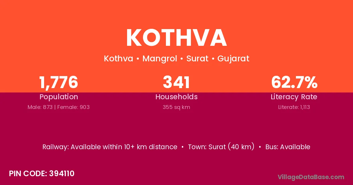 Surat (40 km) is the nearest town to Kothva village for major economic activities and is located approximately 40 km away.