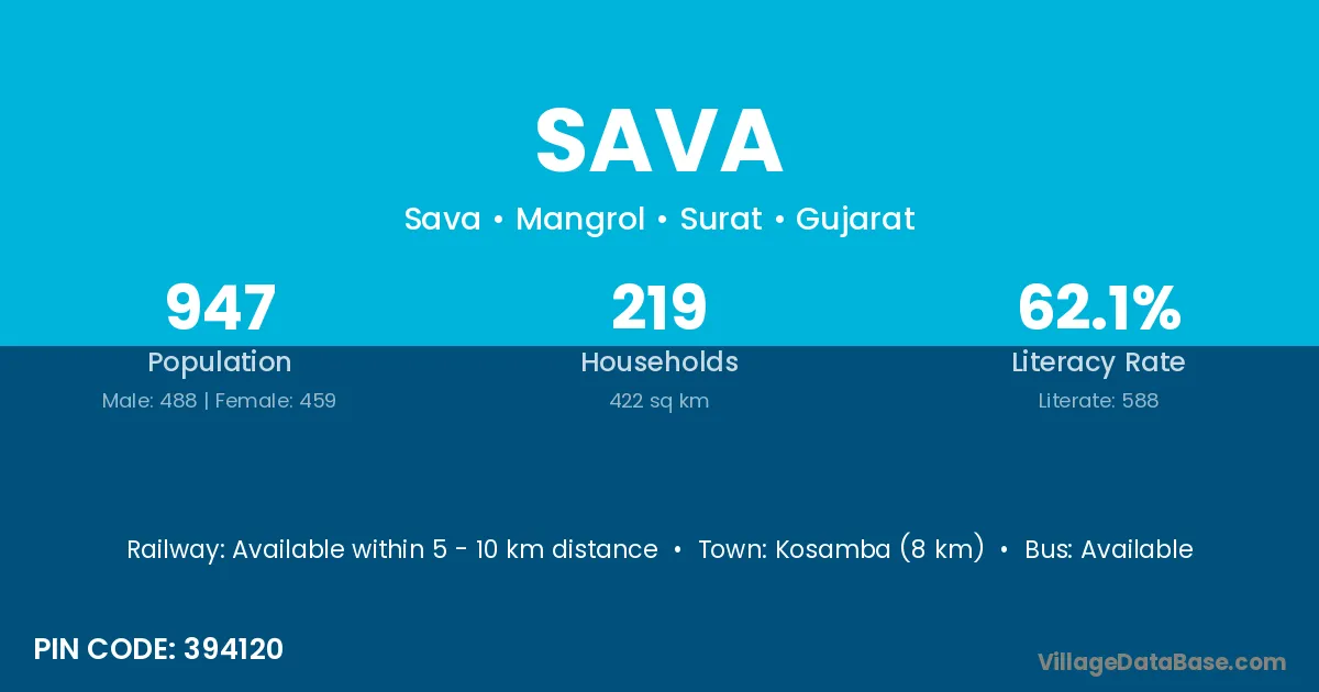 Kosamba (8 km) is the nearest town to Sava village for major economic activities and is located approximately 8 km away.