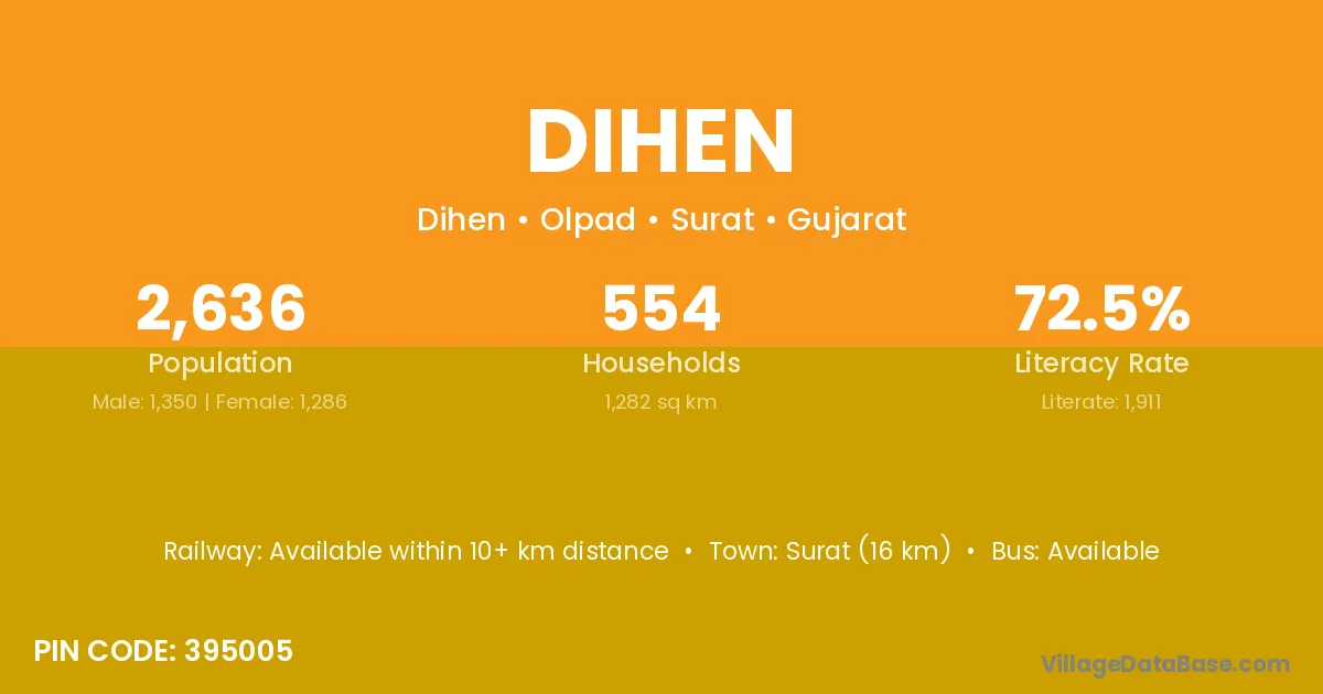 Surat (16 km) is the nearest town to Dihen village for major economic activities and is located approximately 16 km away.