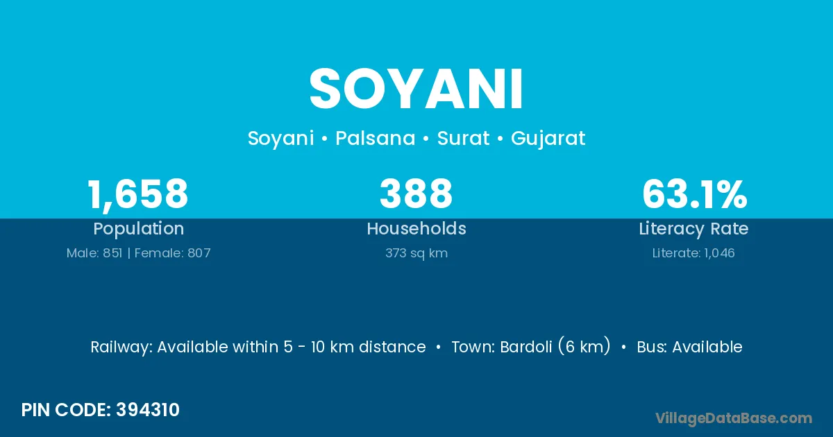 Bardoli (6 km) is the nearest town to Soyani village for major economic activities and is located approximately 6 km away.