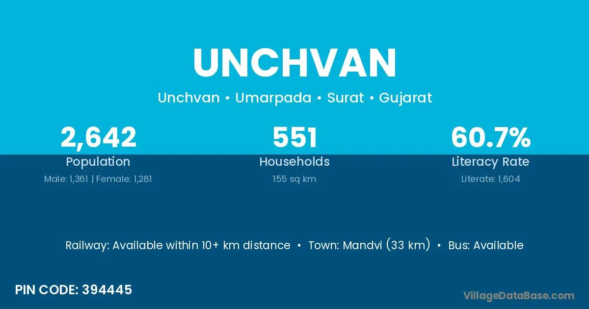 Mandvi (33 km) is the nearest town to Unchvan village for major economic activities and is located approximately 33 km away.