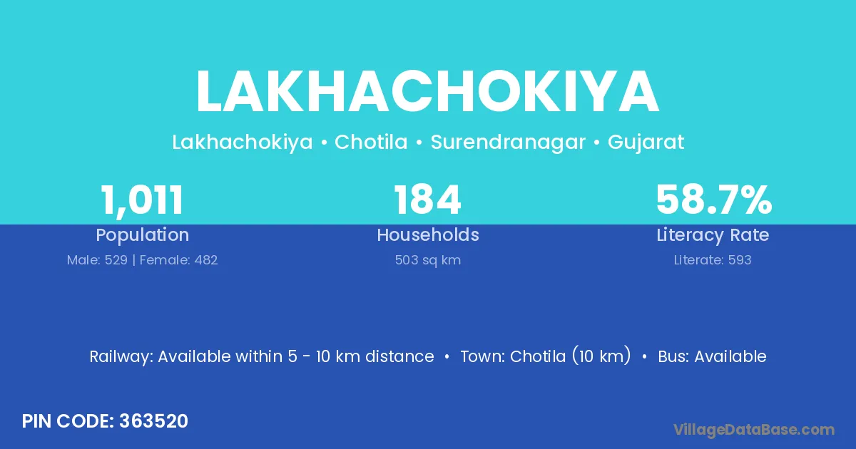 Lakhachokiya village has a total population of 1,011 people, of which 529 are males and 482 are females.