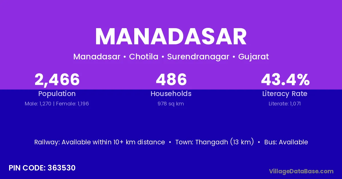 Thangadh (13 km) is the nearest town to Manadasar village for major economic activities and is located approximately 13 km away.