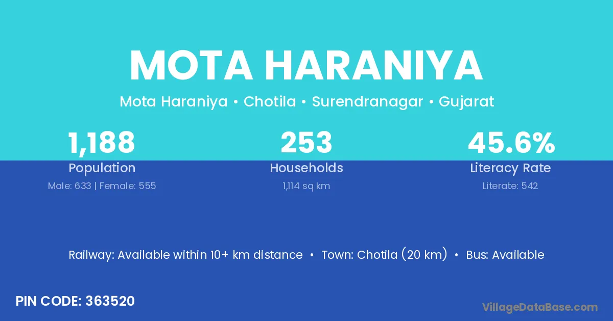 Chotila (20 km) is the nearest town to Mota Haraniya village for major economic activities and is located approximately 20 km away.