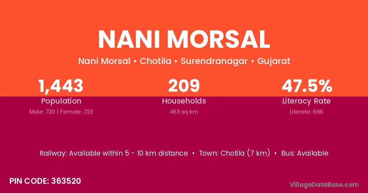 Chotila (7 km) is the nearest town to Nani Morsal village for major economic activities and is located approximately 7 km away.