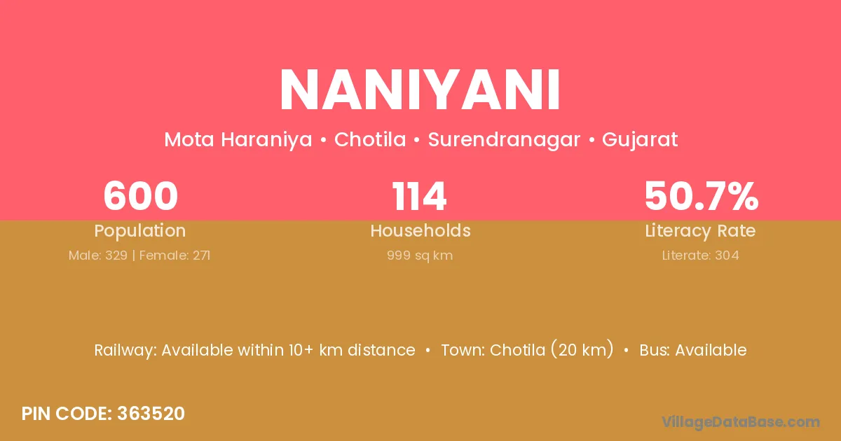 Chotila (20 km) is the nearest town to Naniyani village for major economic activities and is located approximately 20 km away.