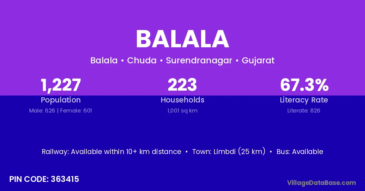 Limbdi (25 km) is the nearest town to Balala village for major economic activities and is located approximately 25 km away.
