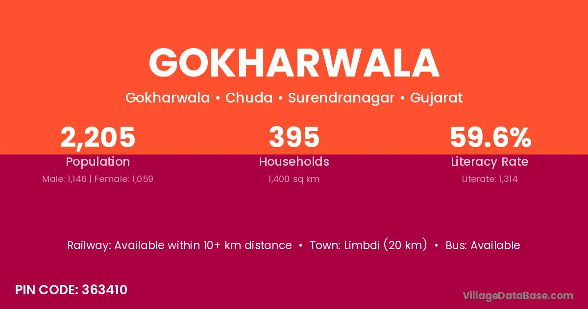 Limbdi (20 km) is the nearest town to Gokharwala village for major economic activities and is located approximately 20 km away.