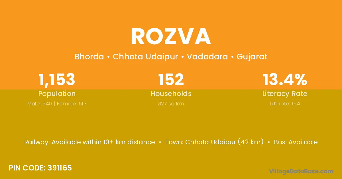 Patdi (48 km) is the nearest town to Rozva village for major economic activities and is located approximately 48 km away.