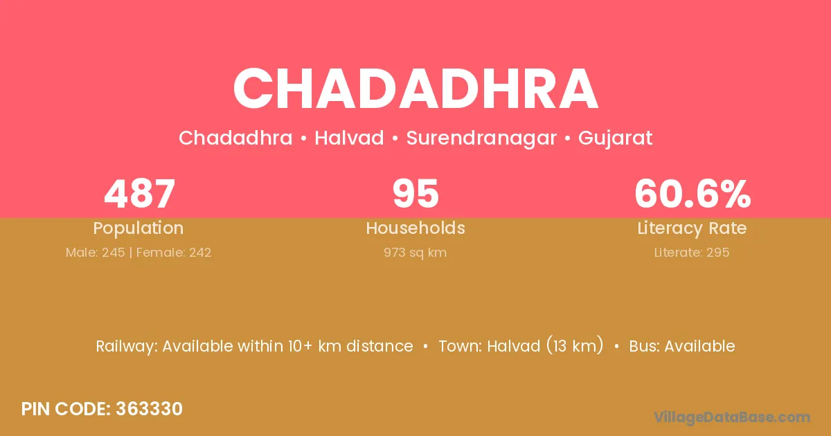 Halvad (13 km) is the nearest town to Chadadhra village for major economic activities and is located approximately 13 km away.