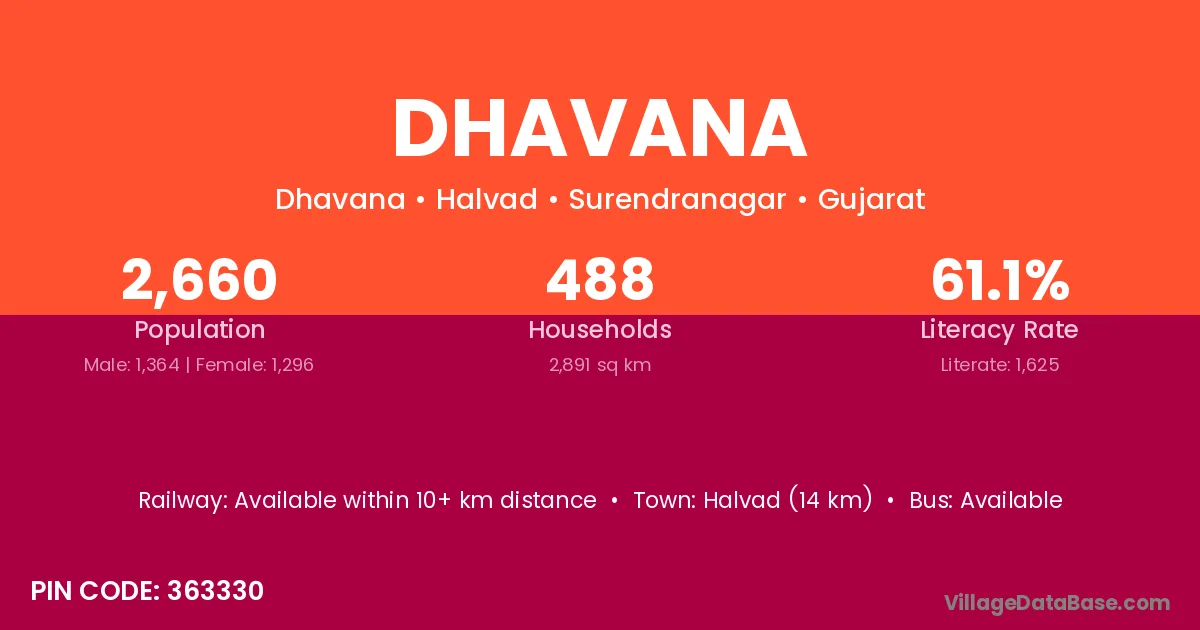 Halvad (14 km) is the nearest town to Dhavana village for major economic activities and is located approximately 14 km away.