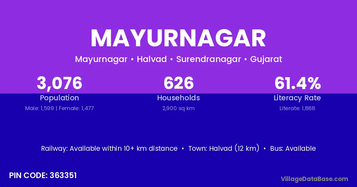 Halvad (12 km) is the nearest town to Mayurnagar village for major economic activities and is located approximately 12 km away.
