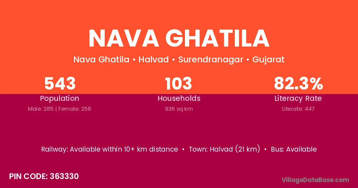 Halvad (21 km) is the nearest town to Nava Ghatila village for major economic activities and is located approximately 21 km away.