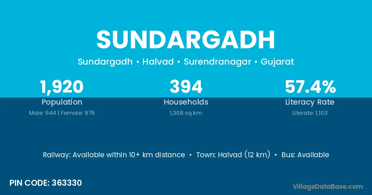 Halvad (12 km) is the nearest town to Sundargadh village for major economic activities and is located approximately 12 km away.