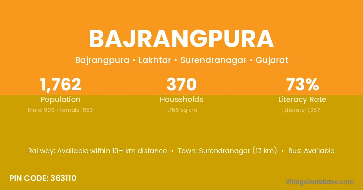 Surendranagar (17 km) is the nearest town to Bajrangpura village for major economic activities and is located approximately 17 km away.