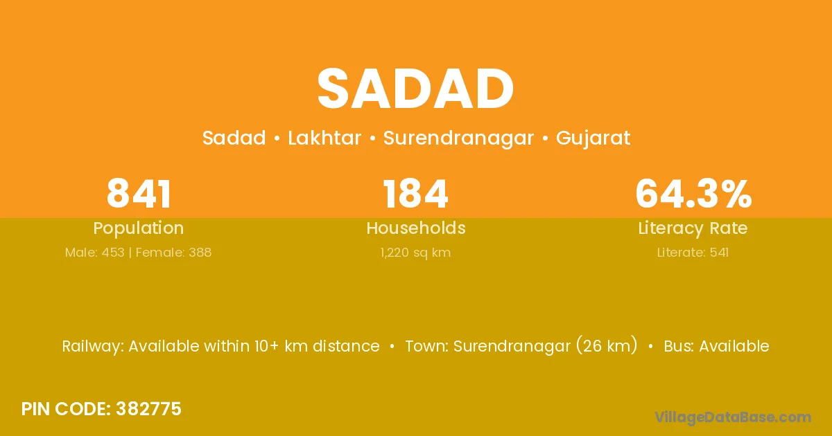 Surendranagar (26 km) is the nearest town to Sadad village for major economic activities and is located approximately 26 km away.