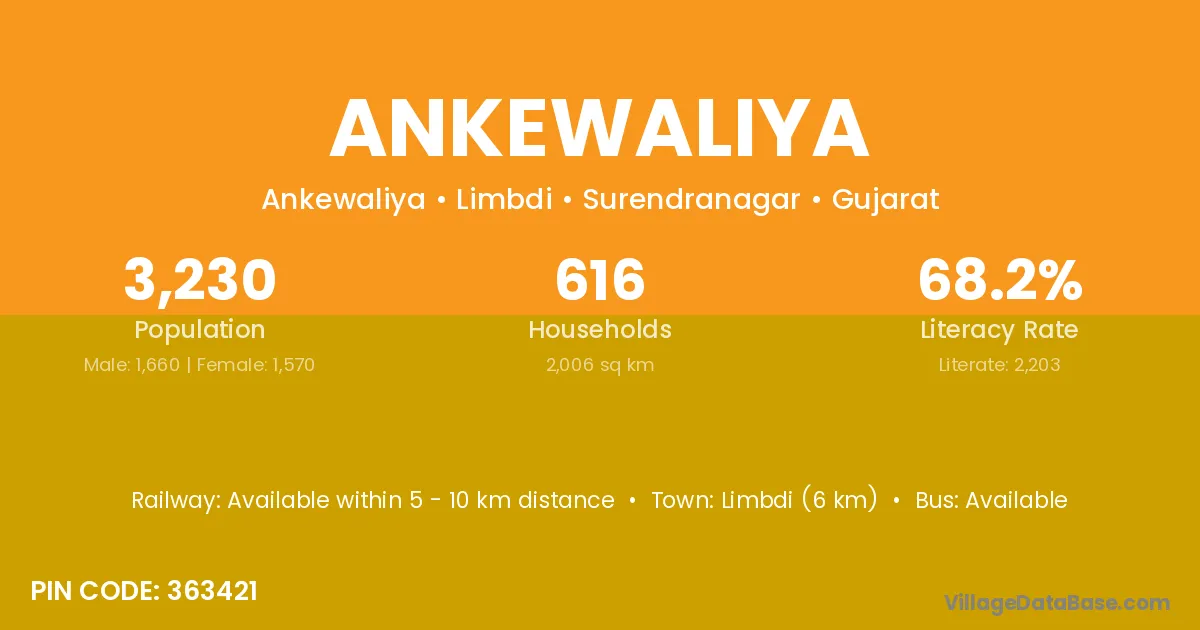 Limbdi (6 km) is the nearest town to Ankewaliya village for major economic activities and is located approximately 6 km away.