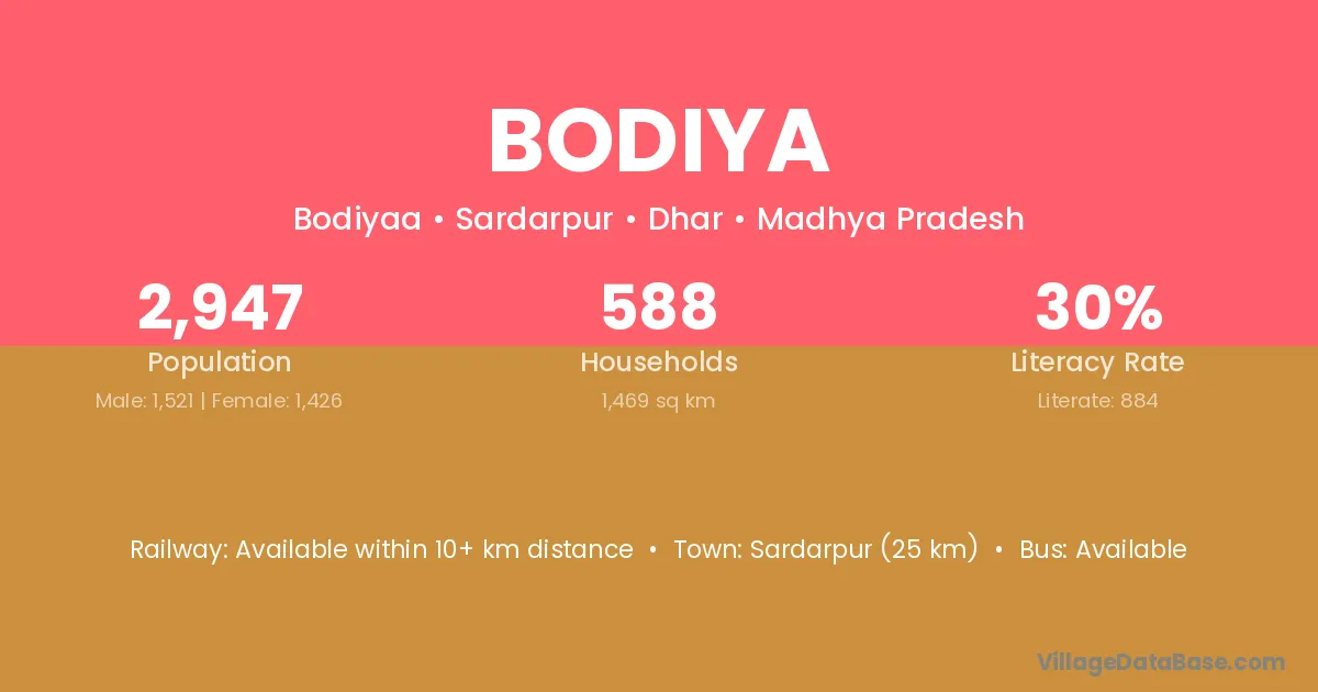 The literacy rate of Bodiya village is 59.51%. Male literacy stands at 69.16% and female literacy at 48.75%.
