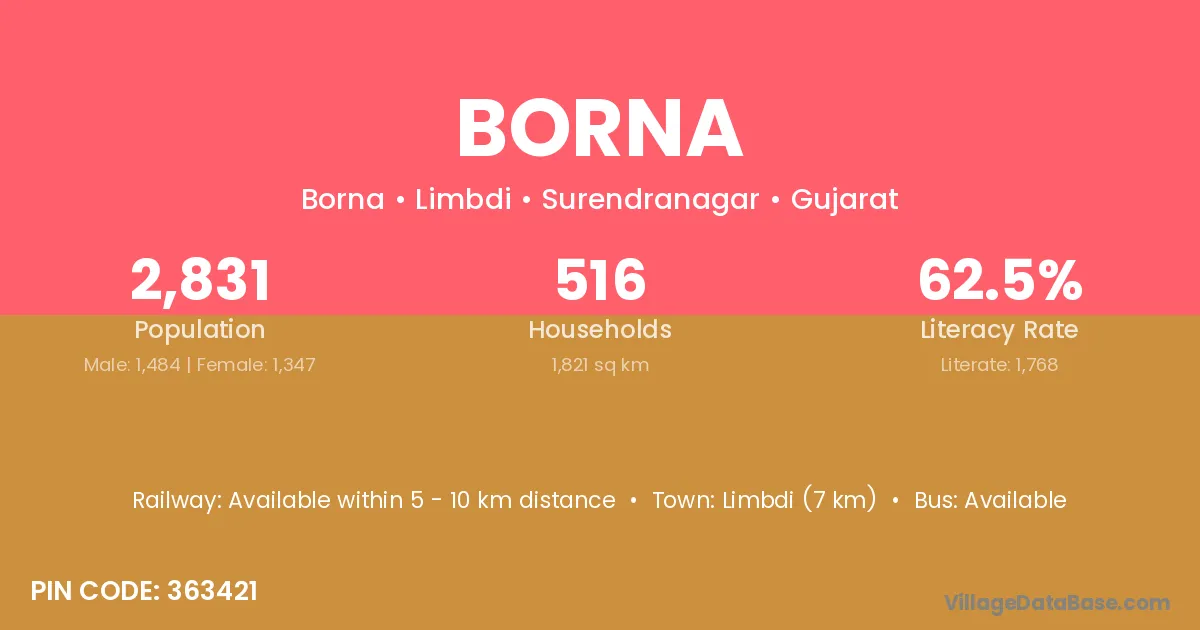 Limbdi (7 km) is the nearest town to Borna village for major economic activities and is located approximately 7 km away.