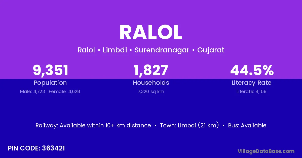Limbdi (21 km) is the nearest town to Ralol village for major economic activities and is located approximately 21 km away.