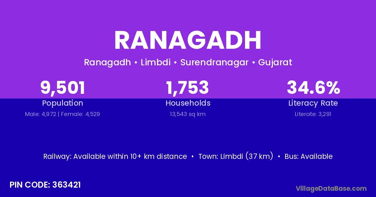Limbdi (37 km) is the nearest town to Ranagadh village for major economic activities and is located approximately 37 km away.
