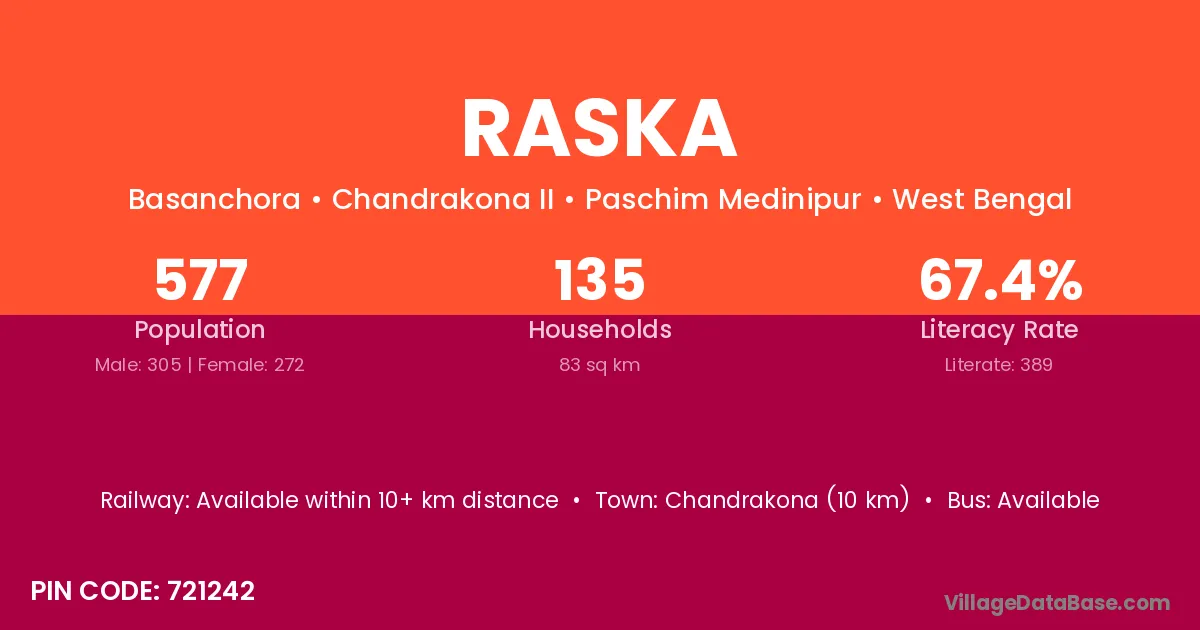 The literacy rate of Raska village is 58.70%. Male literacy stands at 67.62% and female literacy at 49.51%.