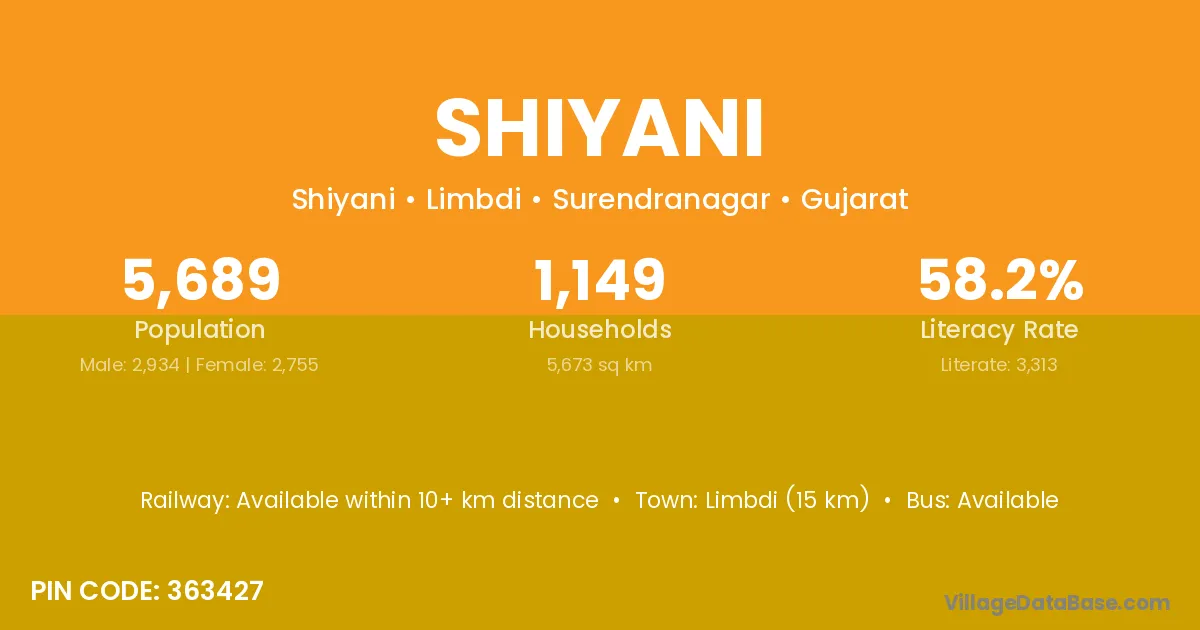 Limbdi (15 km) is the nearest town to Shiyani village for major economic activities and is located approximately 15 km away.