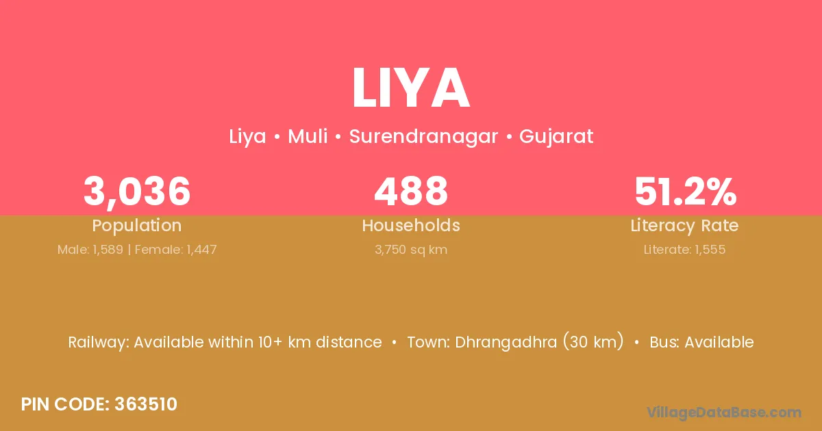 Dhrangadhra (30 km) is the nearest town to Liya village for major economic activities and is located approximately 30 km away.
