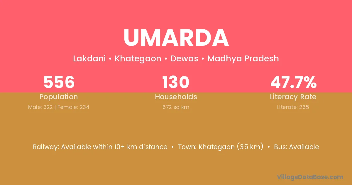 The literacy rate of Umarda village is 55.86%. Male literacy stands at 65.37% and female literacy at 45.99%.