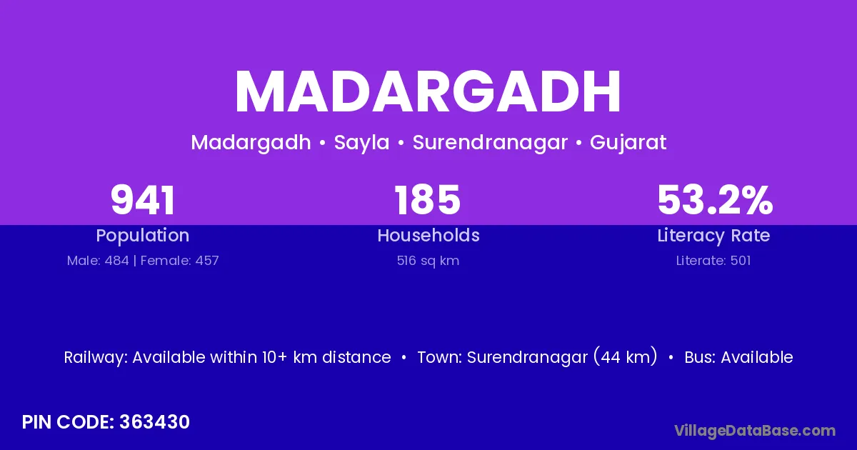 Surendranagar (44 km) is the nearest town to Madargadh village for major economic activities and is located approximately 44 km away.