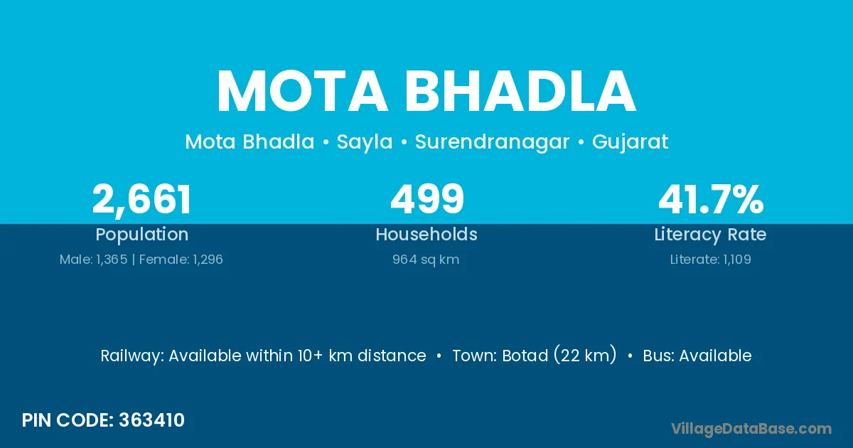 Botad (22 km) is the nearest town to Mota Bhadla village for major economic activities and is located approximately 22 km away.
