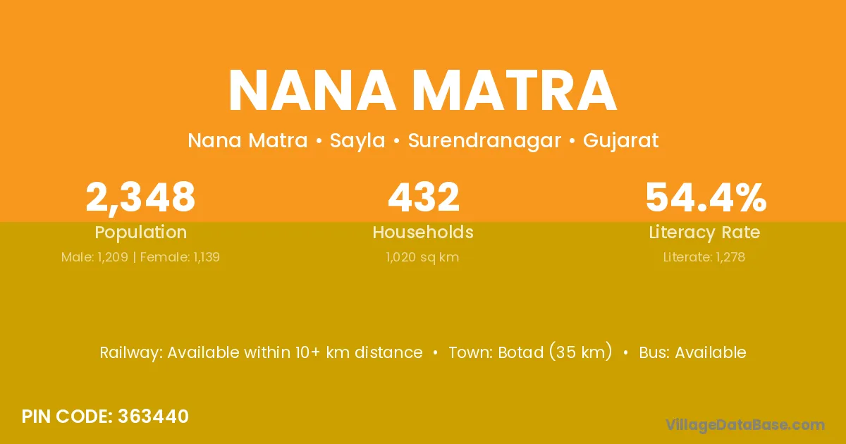 Botad (35 km) is the nearest town to Nana Matra village for major economic activities and is located approximately 35 km away.