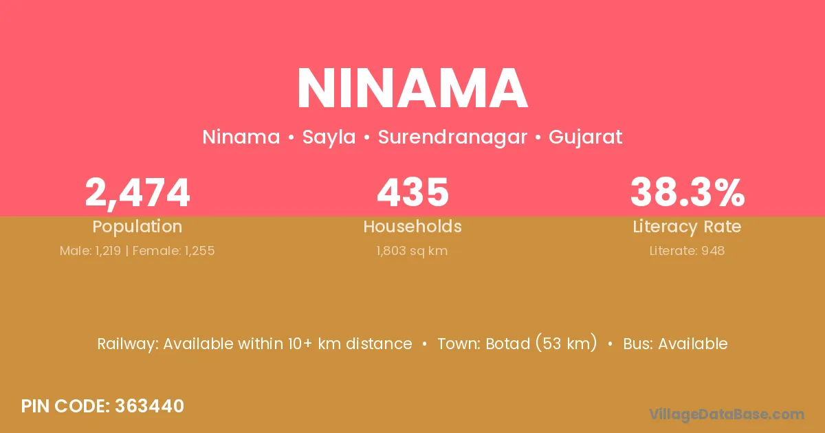 Botad (53 km) is the nearest town to Ninama village for major economic activities and is located approximately 53 km away.